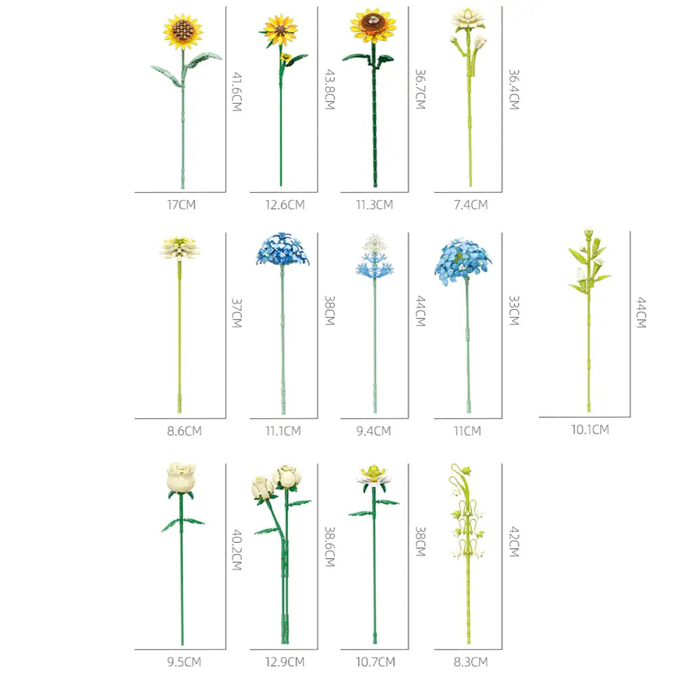 This JIESTAR floral construction set features 13 meticulously crafted blooms representing a diverse botanical palette. The arrangement showcases sunflowers as the focal point, complemented by hydrangeas, gardenias, carnations, roses, and flowering abutilon. Each component is engineered for precise assembly, allowing builders to recreate a sophisticated mixed-flower composition with authentic botanical variety and visual depth.