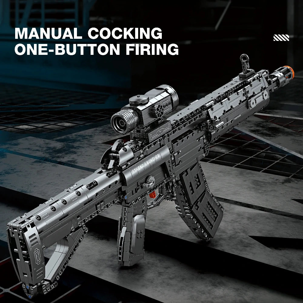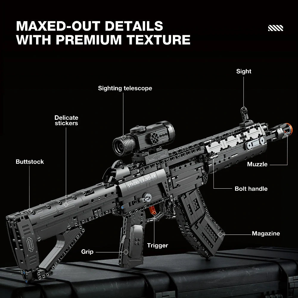 The Reobrix 77024 QBU-191 Rifle Building Block Set delivers an authentically detailed construction experience inspired by the precision marksman rifle platform. This meticulously engineered build captures the distinctive profile and ergonomic proportions of modern tactical rifle design, featuring clean geometry and professional aesthetics throughout. The standout feature is its functional bolt-action mechanism—a manually operated system that replicates the loading sequence of a genuine marksman rifle with satisfying mechanical feedback. The trigger mechanism adds interactive realism, transforming the assembly from a static display piece into an engaging hands-on model. Ideal for enthusiasts seeking technical accuracy and mechanical complexity in their building projects.