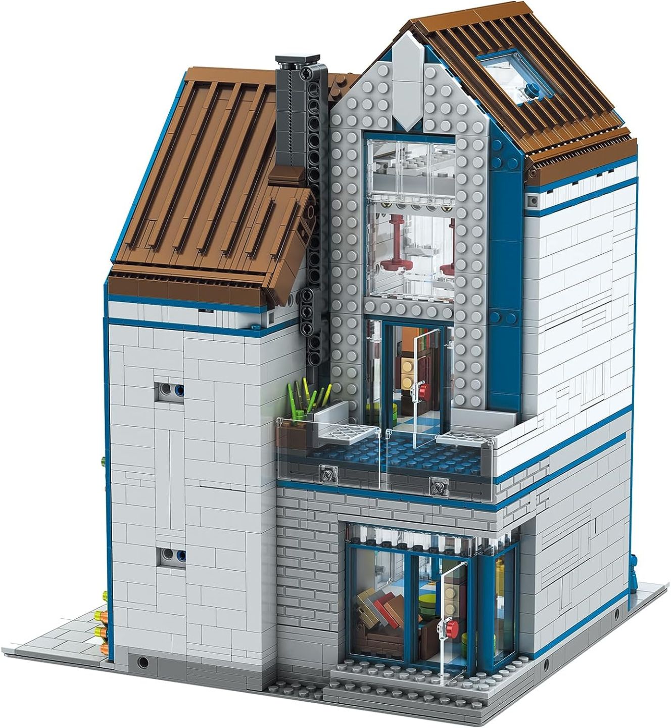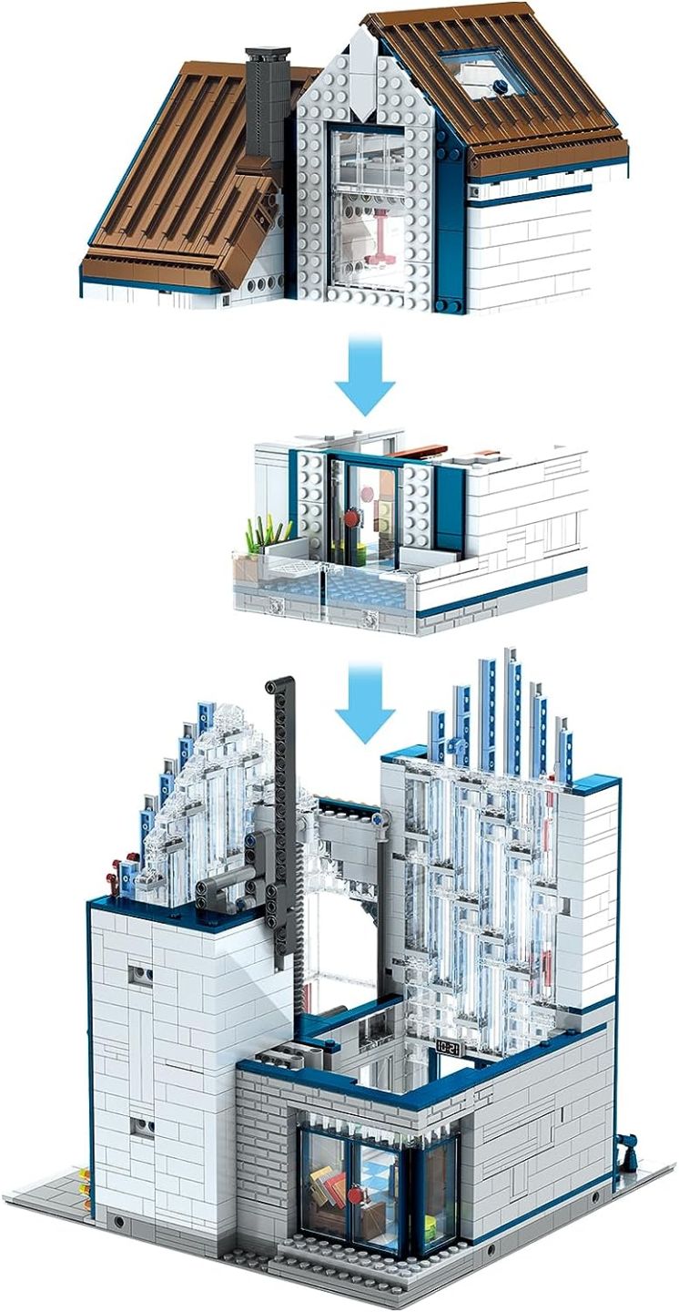 This architectural building set features a contemporary library design with transparent glass paneling throughout, creating an impressive display piece. The set includes a motorized elevator system for vertical movement between levels, complemented by integrated LED lighting that highlights the intricate interior details. Standing over 30cm in height, the structure comprises more than 2,700 precision pieces that assemble into a fully realized space complete with functional windows, detailed bookshelves stocked with miniature volumes, and meticulously crafted furnishings. The combination of working mechanical elements and sophisticated design makes this an engaging build for enthusiasts seeking both aesthetic appeal and interactive features.