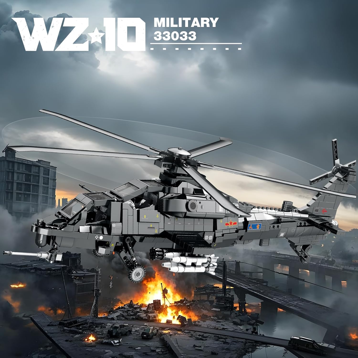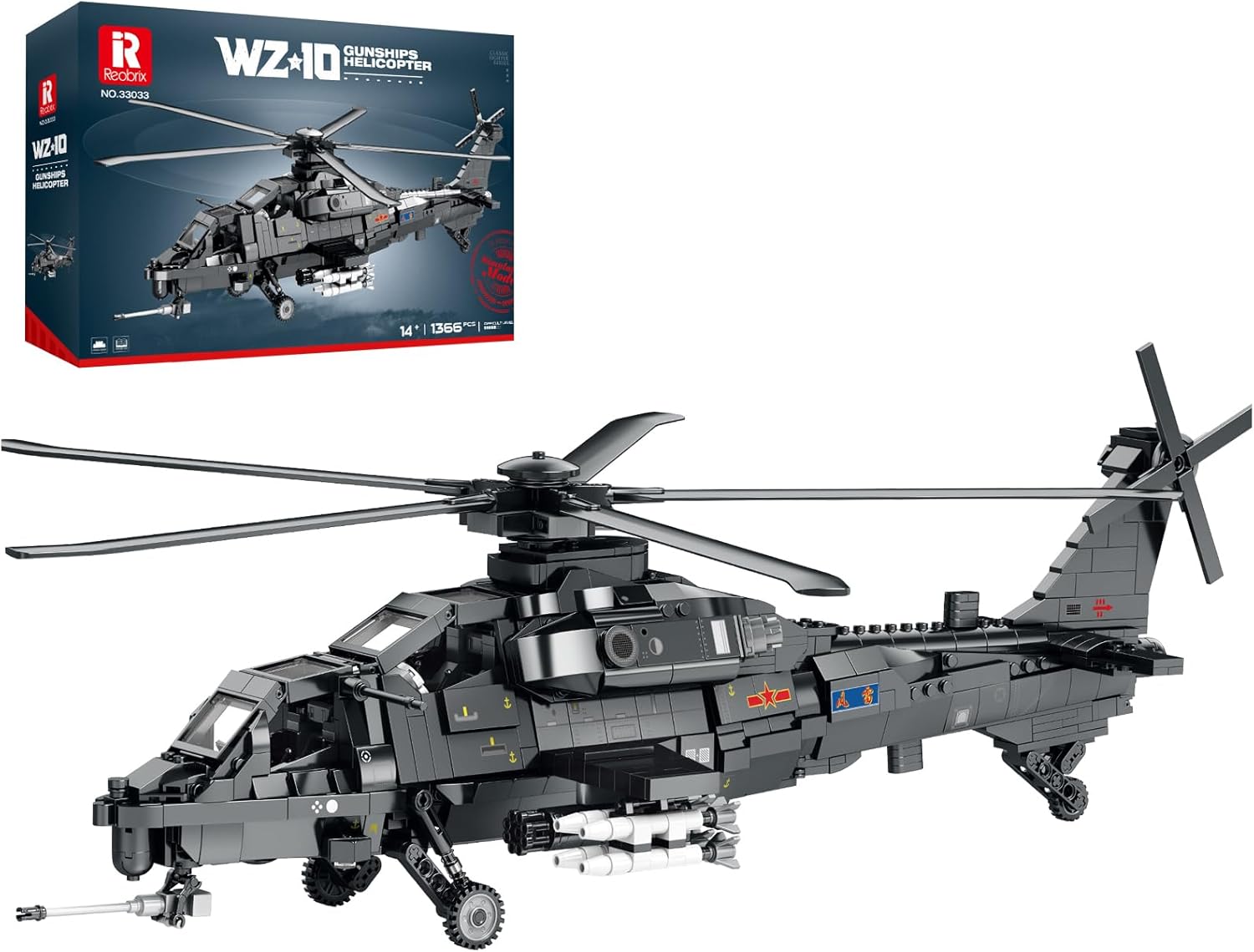 Construct a formidable WZ-10 attack helicopter with this 1,366-piece Reobrix building set, engineered for serious enthusiasts. This advanced military model delivers authentic proportions and tactical details that mirror the real aircraft's combat capabilities. The functional retractable landing gear, precision-engineered rotor system, and intricately detailed cockpit demonstrate Reobrix's engineering excellence. Each component reflects the WZ-10's distinctive architecture, offering a challenging and rewarding build that appeals to experienced builders seeking technical accuracy and sophisticated design.